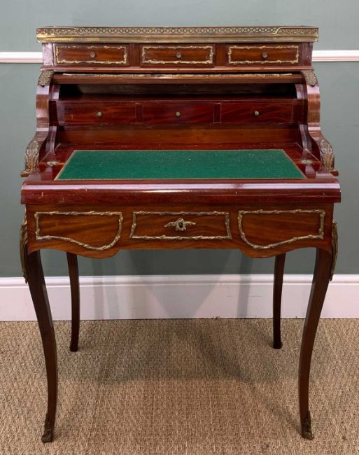 REPRODUCTION LOUIS XV PIANO TOP & FAUX VERNIS MARTIN BONHEUR DU JOUR, brass gallery top, gilt metal mounted, draw fronts, sides, knees and feet, painted, mechanical closure decorated with musicians, 101 (h) x 77 (w) x 53cms (d)Provenance: private collection BridgendComments: old worm, fading, gilt rubbed, painting varnish damaged, inspection advised