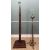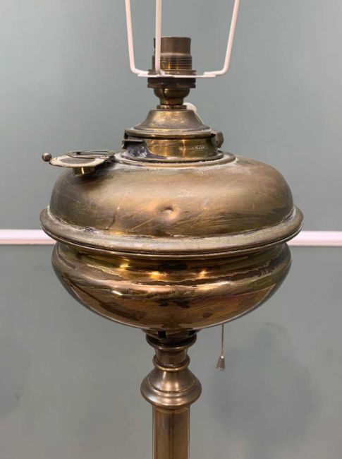TWO STANDARD LAMPS comprising Art Nouveau gilt brass oil lamp with whiplash tripod base and foliate carved mahogany lamp on later base (alterations/adaptions) (2)Provenance: private collection Swansea Comments: gilding worn, wood lamp adapted from a bed post, requires repair, untested