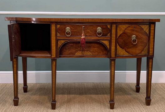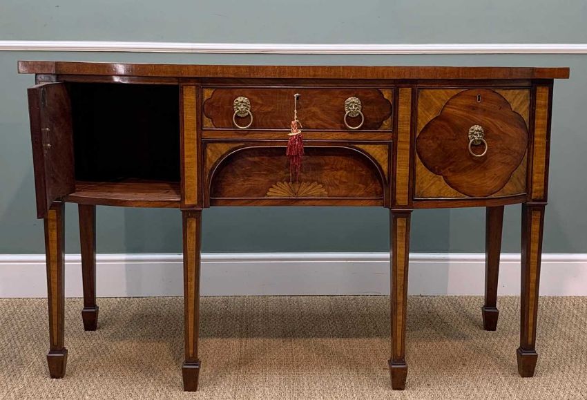 GEORGE III MAHOGANY & SATINWOOD BOWFRONT SIDEBOARD, two central frieze drawers flanked by deep cellarette, and single door cupboard, square tapering legs raised on spade feet, 92 (h) x 153 (w) x 58cms (d)Provenance: private collection Vale of GlamorganComments: stains, water marks, veneer slightly cracked, lead lining partially removed