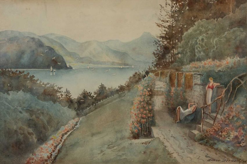 ELLIOT ETTWELL, watercolour - lake scene with girls relaxing by a path, signed and dated '36, 23 x 34cmsProvenance: private collection ConwyComments: framed, glazed, ready to hang
