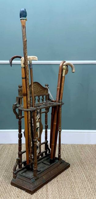 EDWARDIAN CAST IRON STICK STAND with tiled back and assortment of walking canesProvenance: private collection Bridgend