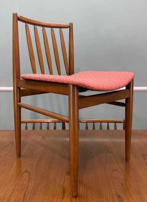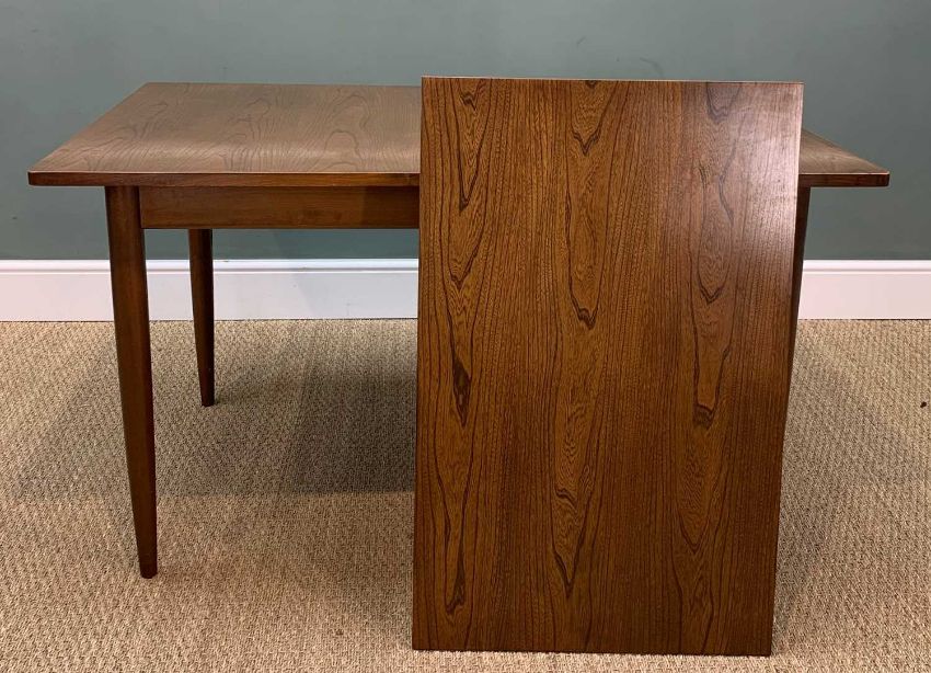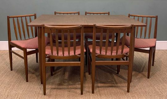 MID-CENTURY TEAK EXTENDING DINING TABLE & CHAIRS, table with extra leaf, 186cms, together with six dining chairs, slatted backs (7)Provenance: private collection Vale of GlamorganComments: one chair with loose seat, upholstery variously stained