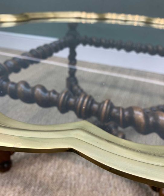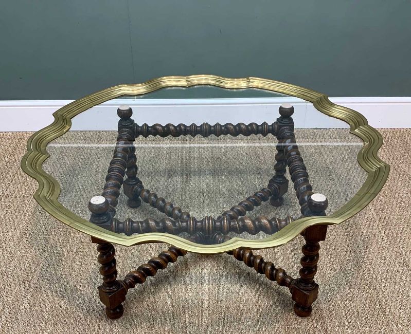 LARGE BRASS EDGED GLASS COFFEE TABLE, freestanding piecrust shaped glass top resting on square barley-twist oak base with x-stretcher, 47.5 (h) x 112cms (dia.)Provenance: private collection Vale of GlamorganComments: large and heavy, consider collection