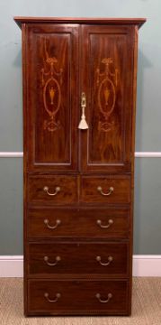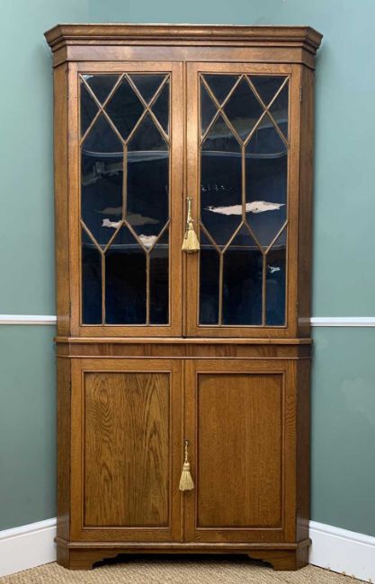 TWO ANTIQUE CABINETS comprising Welsh oak standing corner cabinet with astragal glazed doors on cupboard base, 207cms (h) and an Edwardian mahogany & marquetry narrow cabinet with checker strung borders, later cornice (part of a larger wardrobe), 185cms (h) (2)Provenance: private collection BridgendComments: one glass panel cracked