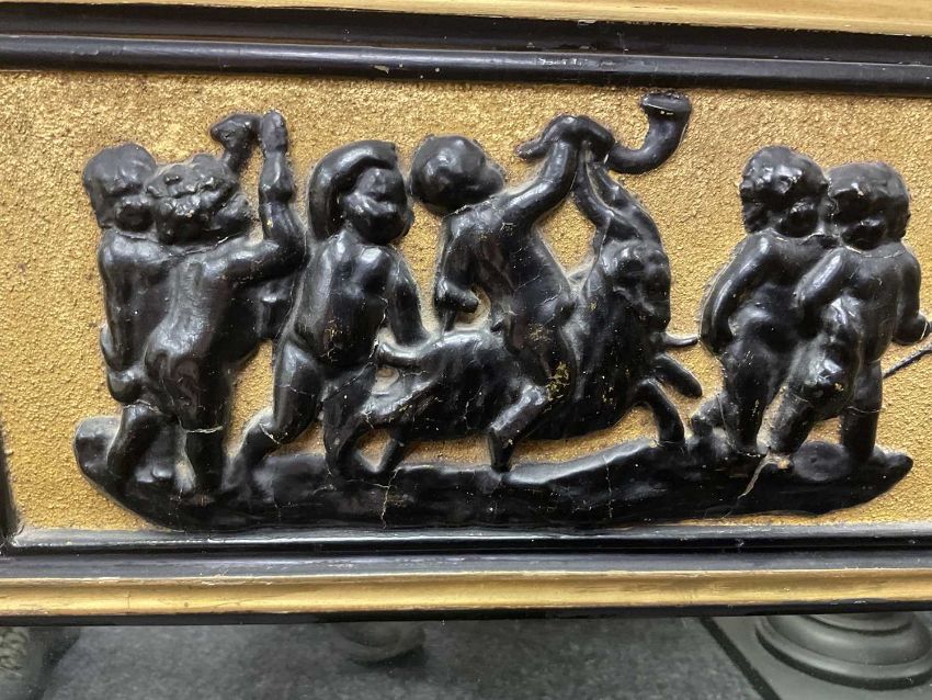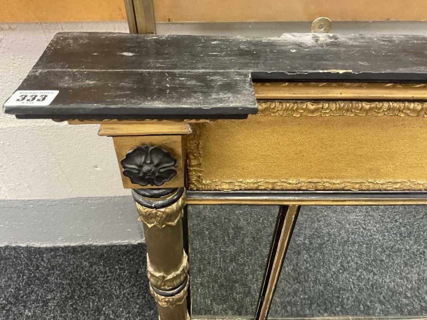 WILLIAM IV PARCEL GILT OVERMANTEL MIRROR with egg and dart cornice above ebonised putti frieze, the triple mirror plate between outset columns on bun feet, 70 x 125cmsProvenance: private collection BridgendComments: restored, regilded, retouched, inspection advised