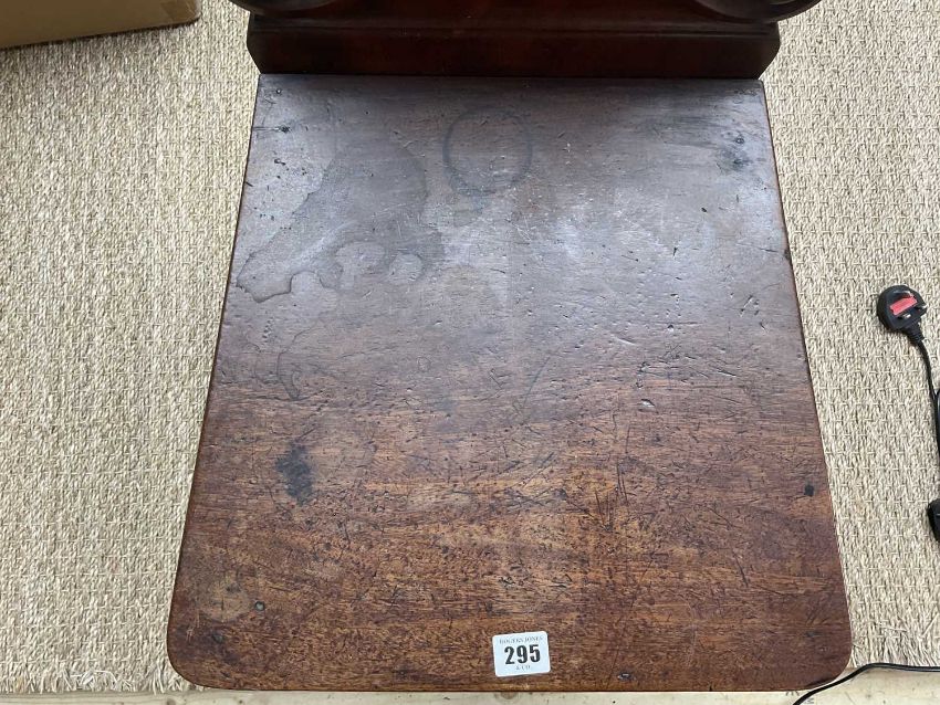 PAIR VICTORIAN MAHOGANY HALL CHAIRS with scroll backs and tapering square section solid seat on turned legs, 84cms (h) (2)Provenance: private collection Pembrokeshire