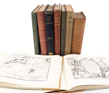 ASSORTED WELSH INTEREST BOOKS, including The White Book Mabinogion, 1907, private press, owner inscribed with some annotations in ink; Facsimile & Text of the Book of Taliesin, 1910, private press limited edition (323/450); Yorke (Philip) Royal Tribes of Wales, 12 lithograph portraits, Bangor City Library stamps to endpapers; Lewis (Timothy) ed. The Laws of Howel Dda - The Facsimile Reprint, 1912; Fisher (Rev. J) Cefn Coch Mss., 1899; N.L.W., Calendar of Wynn (of Gwydir) Papers 1515-1690, 1926, private press limited to 1000 copies; Davies (W. Ll.) The National Library of Wales - A Survey of its History, its Contents and its Activities, 1937, private press limited to 600 copies, dedication to endpaper together with MORRIS (LEWIS) Plans of Harbours, Bars, Bays and Roads in St. George's Channel; lately survey'd under the direction of the Lords of the Admiralty and published with their permission, Facsimile edition, 1987, Edited by Geoffrey Budenberg, Introduction by Adrian Robinson, printed pictorial title, 25 printed plans, charts and plates, Appendix, contemporary half calf, gilt titled and dated spine, oblong 4to (9)Provenance: private collection AngleseyComments: generally scuffed, bumped and moderate foxing, inspection advised. Both Morris books good, one with foxing to calf and fore edge, and marks to rear cover, other better.