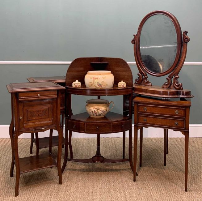 ASSORTED OCCASIONAL FURNITURE comprising pair French bedside cabinets/night tables, pair reproduction Georgian style two-drawer bedside chests, Victorian walnut oval dressing table mirror and Regency style corner washstand with China accessories (6)Provenance: private collection Bridgend Comments: one French table with missing moulding, generally used condition with minor issues