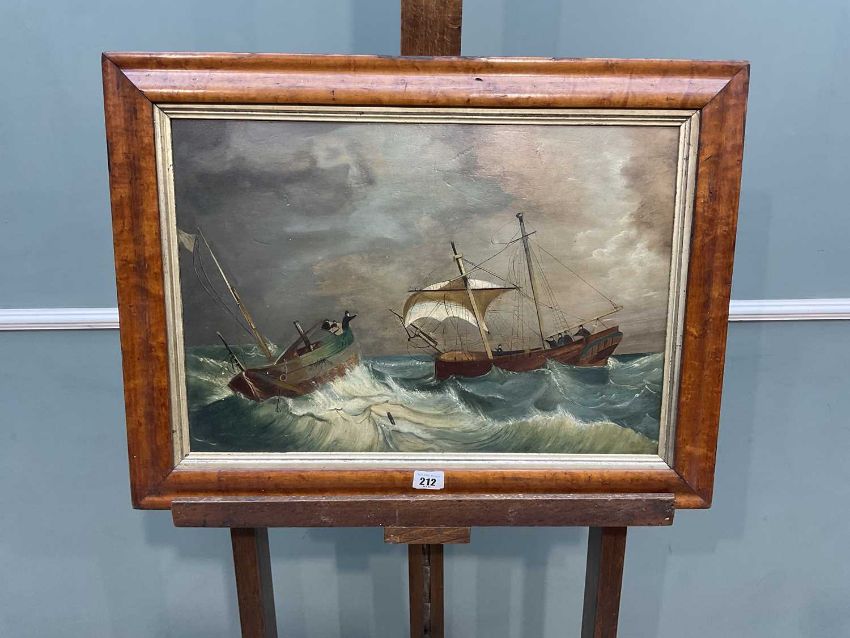 CIRCA 1900 BRITISH NAIVE MARINE SCHOOL oil on board, pair - Tall Ships in Stormy Seas, Fishing Boats in Choppy Seas, 35 x 51cms (a pair)Provenance: private collection CardiffComment: in period maple frames with gilt slips.
