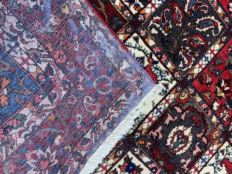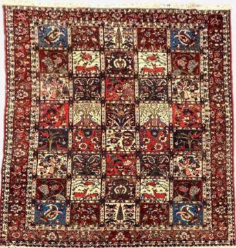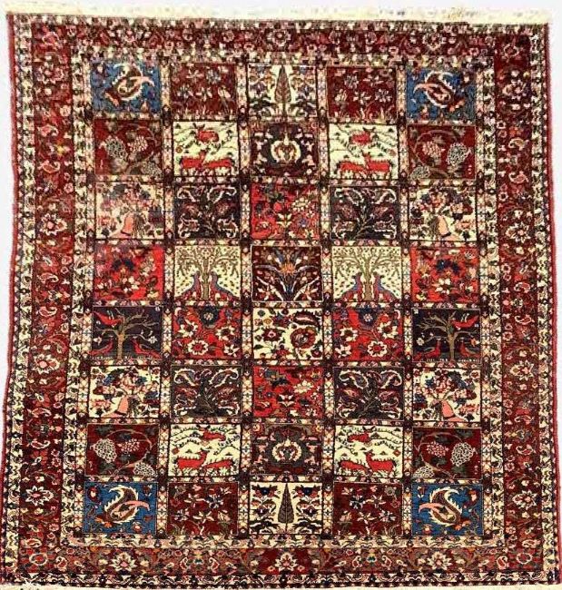 BAKHTIARI GARDEN RUG, stylised flowers, animals, tree's and leaves in compartments, palmette border 326 x 210cmsProvenance: private collection SwanseaComments; moth damage