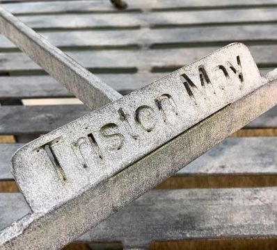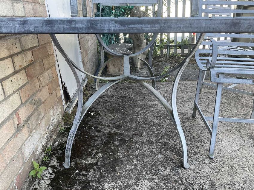 TRISTAN MAY DESIGNED, HANDMADE GARDEN FURNITURE, rectangular table with four role back chairs, galvanized metal, each piece bearing a signature plaque, table 74 (h) x 180 (w) x 90cms (d)Provenance: private collection Vale of GlamorganComments: good condition, minor weathering, undamaged, heavy object - consider collection