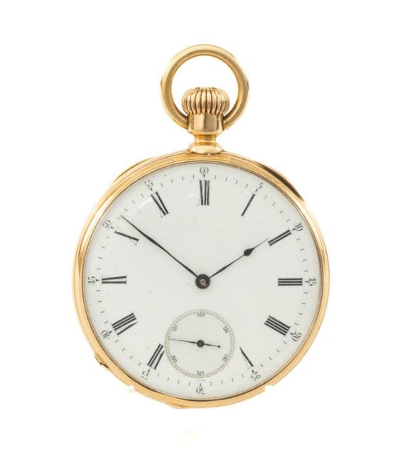 FINE 18CT GOLD PATEK PHILIPPE KEYLESS WIND POCKET WATCH, c. 1890s, Swiss frosted gilt bridge lever movement jewelled through the centre, bimetallic balance, overcoiled spring, wolf's tooth winding gears, white enamel dial, Roman hours and Arabic minutes chapters, subsidiary seconds dial, blued steel hands, plain case, cuvette engraved Patek Philippe & Co. Geneva, Twerembold & Fils, Florence, No. 32330, 48mm (diam.), 91.6gProvenance: private collection MonmouthshireComments: excellent, minor surface scratches as normal, minute hand very slightly bent, perspex loose.