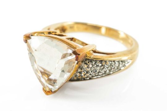 9CT QUARTZ RING, the trilliant cut stone 12mm (diam.), with multiple, presumed, white sapphire accented shoulders, 5.3gProvenance: private collection Vale of GlamorganComments: ring size N, maker R&C.