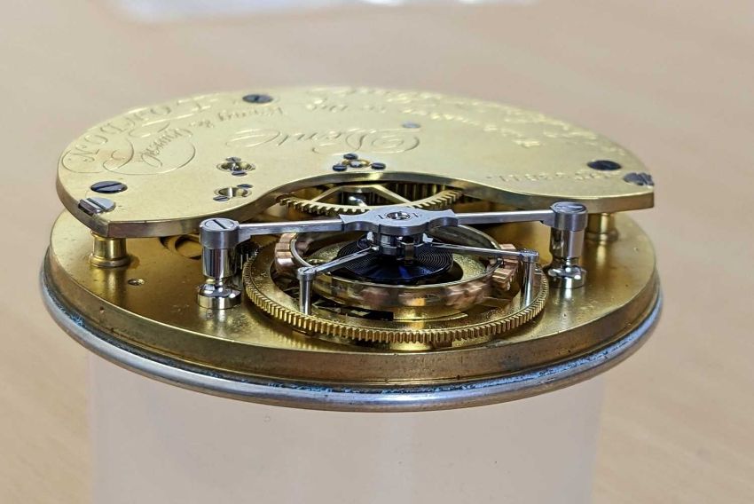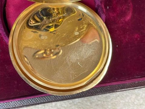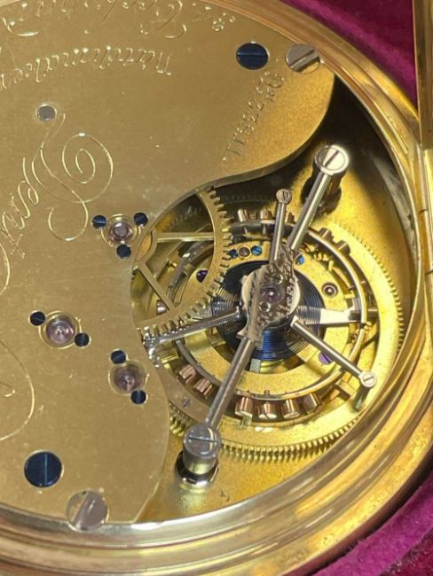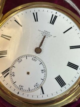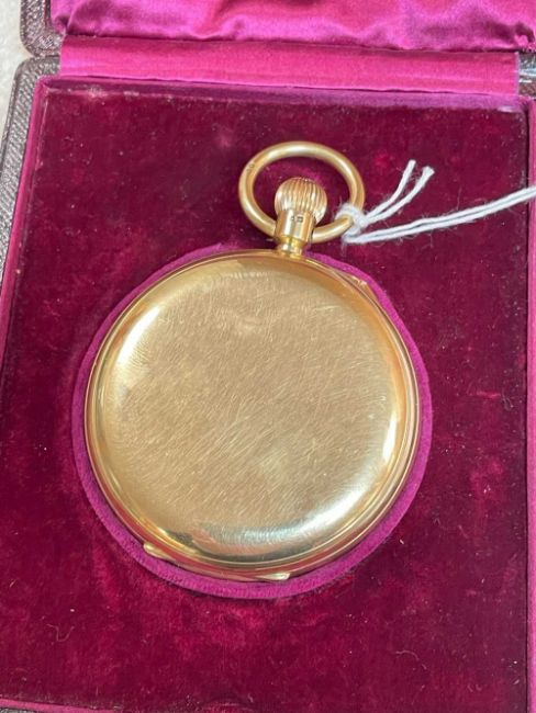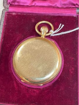 FINE & RARE 18CT GOLD TOURBILLON HUNTER CASED POCKET WATCH, E.J. Dent, London 1918, white enamel Roman dial with large sunk subsidiary seconds dial, with gilt-finished three-quarter plate lever movement, steel three-arm tourbillon carriage, hinged glazed dust cover, heavy plain circular case, revolving six minute tourbillon probably by Nicole Nielson, bi-metallic compensation balance, plate signed Dent, Watchmaker to the King & Queen, 34 Cockspur Street, London, and numbered 33811, dial similarly signed & numbered, plate stamped numeral '1191', gold case with makers mark 'RN' for Robert North, in purple case of issue with gilt stamped inner lid, 58mm (diam.), 205.8gAuctioneer's Note: Dent was established by the talented horologist Edward John Dent, who at the age of 17, transferred his apprenticeship from the trade of tallow chandler to watchmaking under the charge of Edward Gaudin in 1807. By 1817 he had become well known as a watch and clockmaker receiving commissions from the Admiralty for a 'Standard Astronomical Clock' and pocket chronometers for the Colonial Office Africa Expedition. In 1830 Dent went into partnership with the renowned watch and chronometer maker John Roger Arnold which continued until 1840 when he left and set up business alone as E.J. Dent at 82 Strand, London, primarily making marine chronometers, watches and precision clocks. In 1843 the firm expanded taking on a second premises at 33 Cockspur Street, with the Strand premises moving down the road to number 61 by 1851. In 1852 Edward Dent successfully tendered to make the 'great clock' to be housed in Stephen's tower at the New Palace of Westminster. The clock was completed by 1859, apparently at a financial loss to the firm, however it ensured that Dent became a household name synonymous with fine clockmaking. Unfortunately Edward John Dent did not live to see the installation of the 'great clock' as he died in 1853. He was succeeded by his stepson Frederick Rippon Dent, who, in partnership with his brother Richard, continued to expand the business. By 1862 the firm had added 34 Cockspur Street and 34 & 35 Royal Exchange to their list of addresses and, although having seen natural passage of ownership over the intervening years, the business still continues to trade today as Dent & Co.Compare with Charles Frodsham tourbillon pocket watch at Christies Geneva, lot 480, 18 May 2021 sale with similar movement.Provenance: private collection Monmouthshire, has been in the same ownership since it was purchased by the ancestor of the vendor, thought to be an 18th or 21st birthday present.Comments: dial with typical hairline crack between centre of dial and edge of subsidiary seconds dial. The remains of the severely corroded hour and minute hands have been removed, seconds hand missing entirely. Dial lettering still fresh. The movement and dial have been inspected (see images). Movement surprisingly very good overall with very light surface tarnish to one gear. Hand barrels pin-adjust as normal, ticks away nicely, and appears to be in very good overall condition despite the corrosion to the hands which are now in pieces. Glass missing. Outer case of issue with light surface scuffs only.
