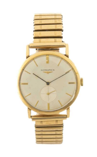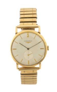 LONGINES YELLOW METAL DRESS WATCH, circular dial with baton hour markers, subsidiary seconds dial, presentation engraving to caseback 'To mark 34 Years Service Capt. C. S. A. Colburn with The British Petroleum Group 14th April 1959', expanding bracelet stamped 'Excalibur 59 9ct. BK. & FT'Provenance: private collection Swansea, by family descentComments: not ticking, wear commensurate with age, viewing recommended