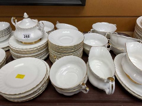 EXTENSIVE ROYAL ALBERT 'VAL D'OR' BONE CHINA SERVICE including coffee pots, tea pots, milk jug, sugar basins, soup coupes, gravy boats, saucers, side plates, dishes, cruets, petit fours stands, serving dishes, cereal bowls etc. (approx. 227)Provenance: private collection BridgendComments: some items used, inspection advised