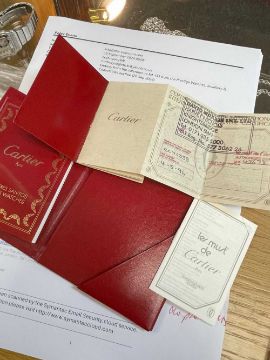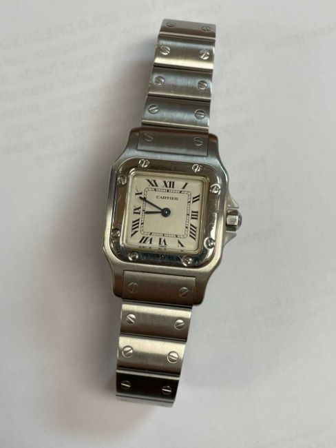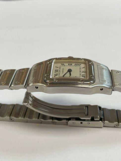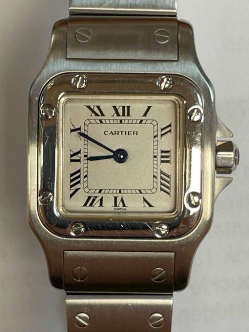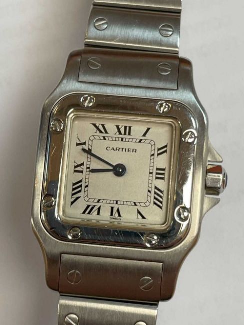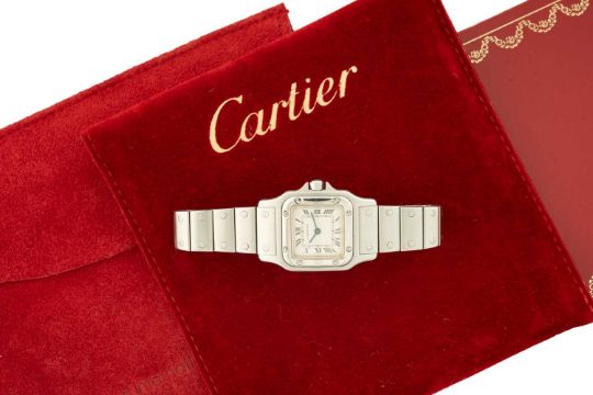 CARTIER SANTOS LADIES STAINLESS STEEL WRISTWATCH, Ref. 1565, the signed square dial with Roman numerals and secret signature at 10 o'clock, gem set winding crown, signed tapering bracelet, case back signed and numbered CC70358, quartz movement, with booklets, purchase receipt dated 2010 and plush soft casesProvenance: private collection CarmarthenshireComments: light wear overall, not tested as working, viewing recommended
