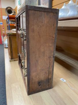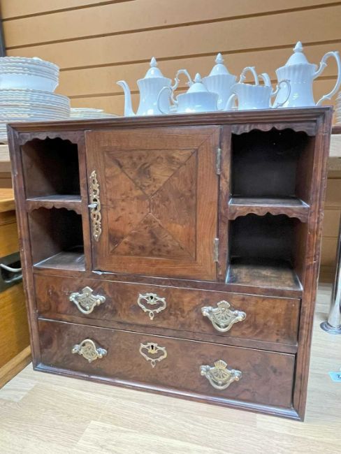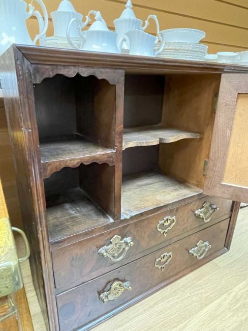 EDWARDIAN AMBOYNA & YEW TABLE CABINET, fitted cupboards and pigeon holes and drawers.Provenance: private collection Vale of GlamorganComment: crack to side. Condition Report:Height - 44cmsLength - 46cmsDepth - 16cms