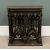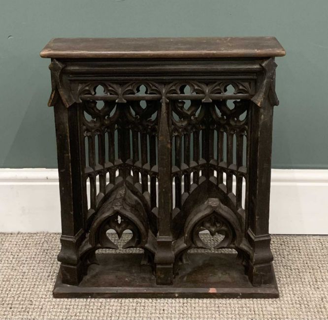 STAINED & LEADED GLASS PANEL in wooden frame, 69 x 52cms and Gothic/medieval effect floor standing shelf, 53 (h) x 48 (w) x 13cms (d)Provenance: private collection Conwy