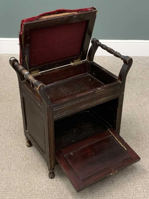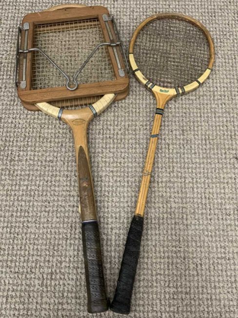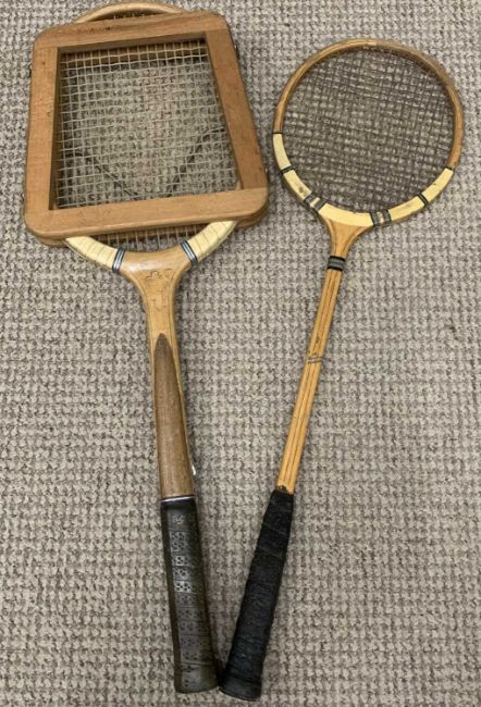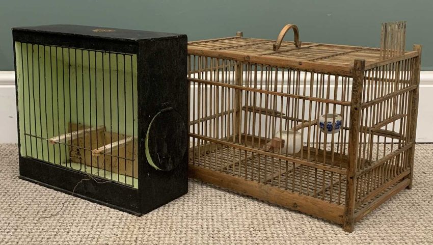 GROUP OF VARIOUS VINTAGE FURNISHINGS including wooden birdcages (2), footstool, tennis rackets, luggage, piano stool etc.Provenance: private collection Conwy