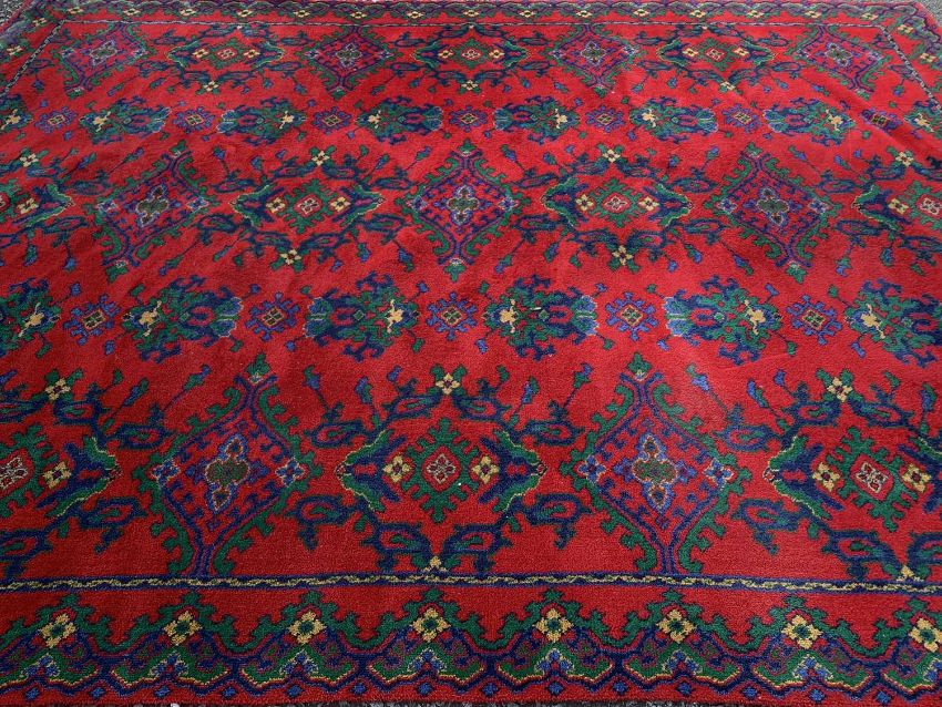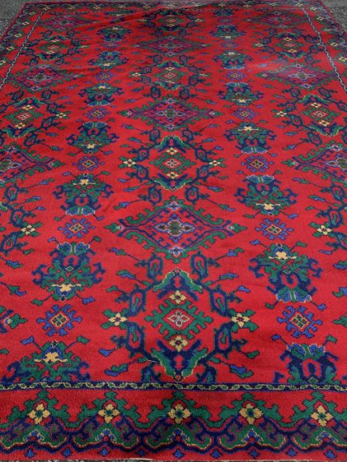 ANTIQUE TYPE RUG, red ground with blue and green geometric and floral patterns, 360 x 273cmsProvenance: private collection Conwy