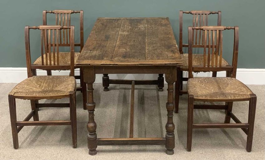 SMALL OAK REFECTORY TABLE 19th Century, with three planks to top, 72 (h) x 141 (w) x 69cms (d) and four rush seated chairsProvenance: private collection Conwy
