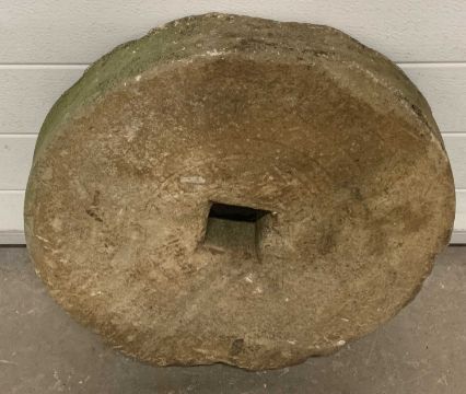 GARDEN OBLONG STONEWARE TROUGH/PLANTER, 28 (h) x 90 (w) x 40cms (d) and old grinding stone, 10 (h) x 52cms (diam.)Provenance: private collection Conwy