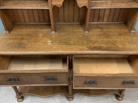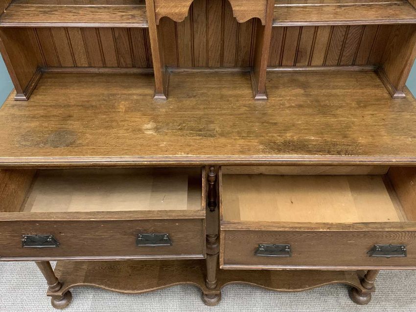 20TH CENTURY OAK POT BOARD DRESSER, rack with multiple shelves and central cupboard doors, two drawers to base, shaped apron and bottom shelf, 217 (h) x 153 (w) x 56cms (d)Provenance: private collection Denbighshire