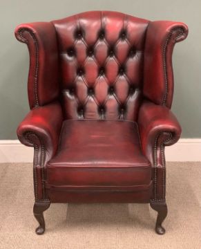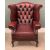 CHESTERFIELD STYLE OXBLOOD RED LEATHER/LEATHER EFFECT THREE PIECE SUITE, winged button back two-seater sofa, 106 (h) x 140 (w) x 56cms (d) and pair of winged button back armchairsProvenance: deceased estate Anglesey