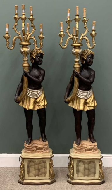 BLACKAMOOR CANDELABRA, reproduction pair converted to standard lamps on pedestal bases, 192cms (h), the base 42 (w) x 29cms (d)Provenance: private collection Conwy