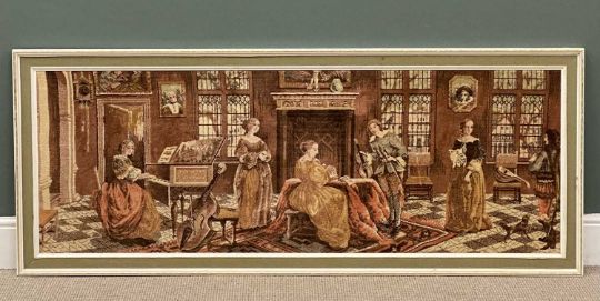 TWO LARGE VINTAGE TAPESTRIES, Eastern rural scene, 160 x 114cms, and Victorian interior scene, 72 x 177cms (2)Provenance: private collection Conwy