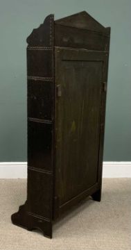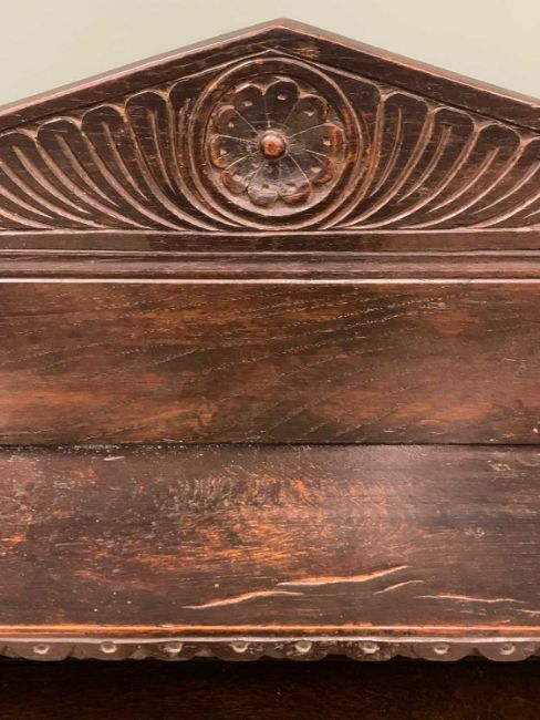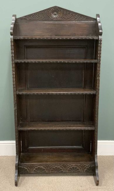 VINTAGE CARVED OAK OPEN BOOKCASE, five shelves, with steeple back, 159 (h) x 72 (w) x 36cms (d)Provenance: deceased estate Conwy