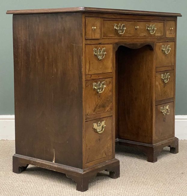 GEORGIAN WALNUT KNEEHOLE DESK, twin pedestal, kneehole cupboard, row of two small and two other drawers, and pullout tooled surface, on bracket feet, with brass drop handles, 83 (h) x 89 (w) x 47cms (d)Provenance: private collection Anglesey