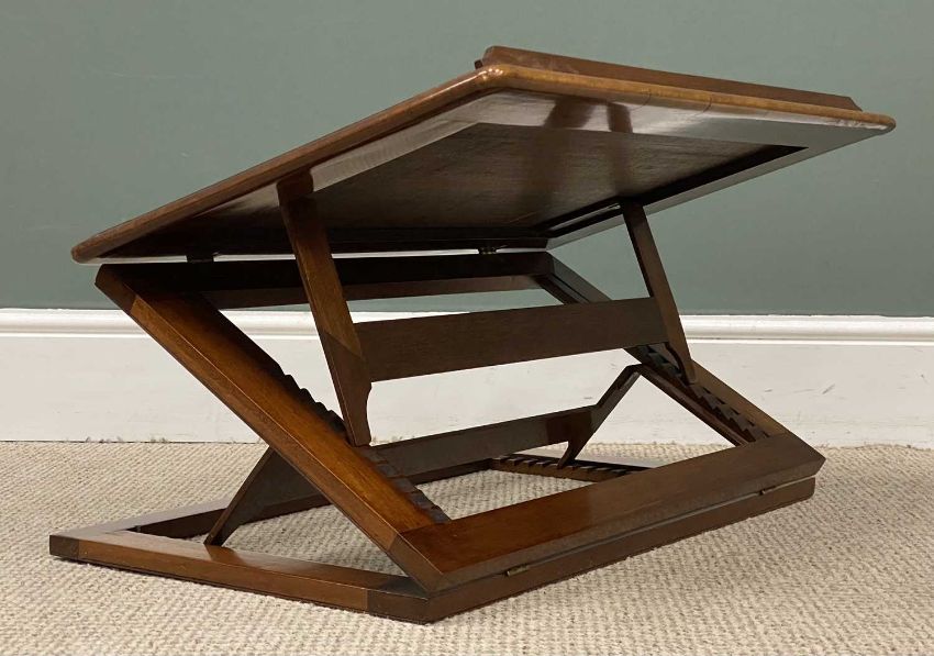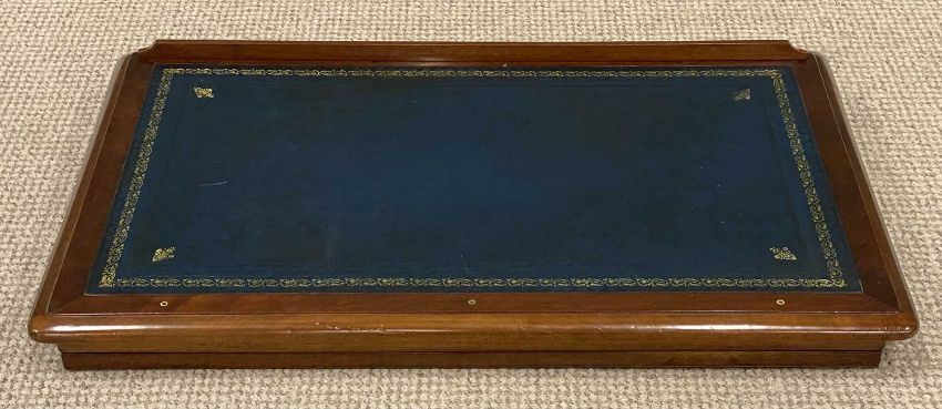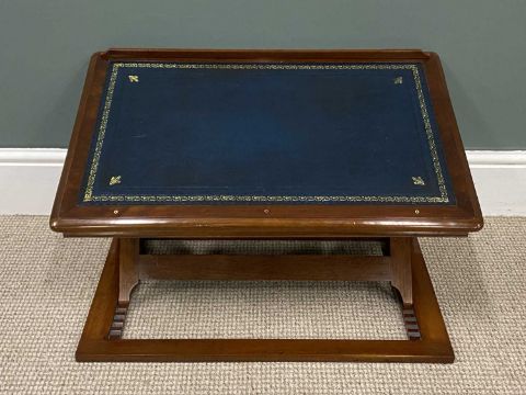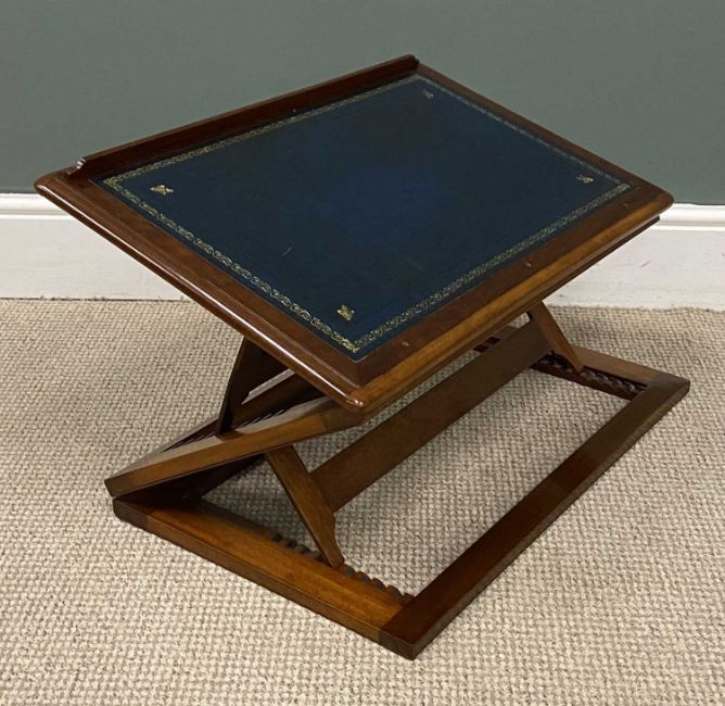 MAHOGANY TABLETOP LECTERN /WRITING STAND adjustable with tooled blue leather surface, 9 (h) x 72 (w) x 45cms (d)Provenance: deceased estate Denbighshire