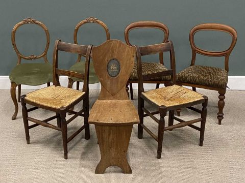 VINTAGE & ANTIQUE CHAIR ASSORTMENT including balloon back, rush seated chairs, Welsh dragon Arts & Crafts type chair, etc. (7)Provenance: private collection Conwy