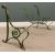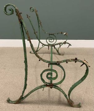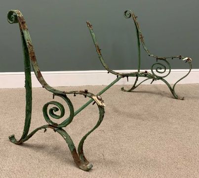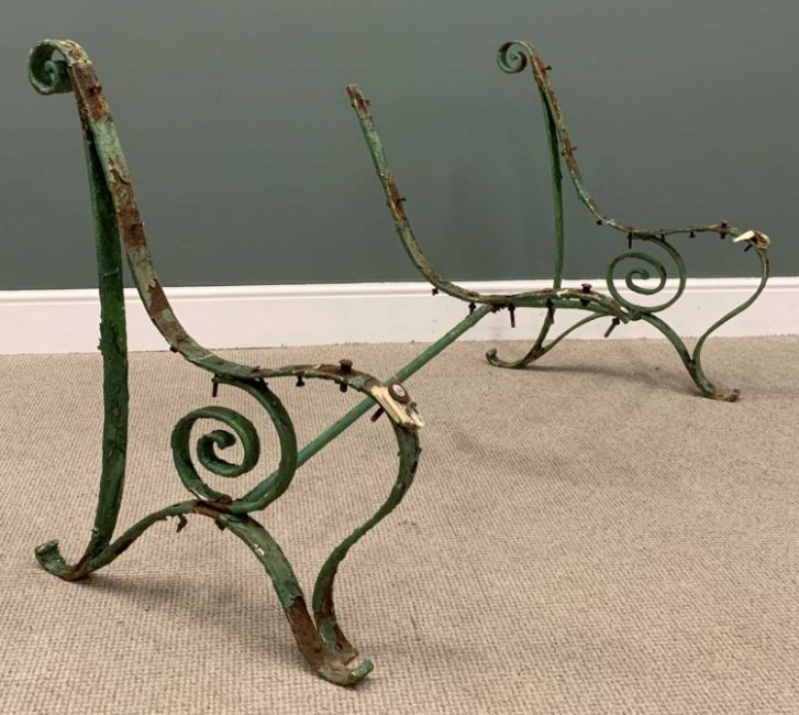 TWO VINTAGE WROUGHT/CAST IRON GARDEN BENCH ENDS WITH STRETCHERS (no slats), one painted green, 84 (h) x 156 (w) x 64cms (d), the other painted white, 92 (h) x 160 (w) x 59cms (d)Provenance: private collection Conwy