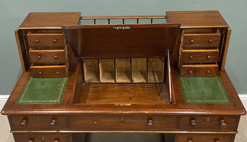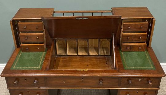 GOOD MAHOGANY TWO STAGE DESK configured with writing slope and drawers to pedestal and top, 102 (h) x 118 (w) x 60cms (d)Provenance: deceased estate Denbighshire
