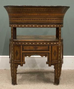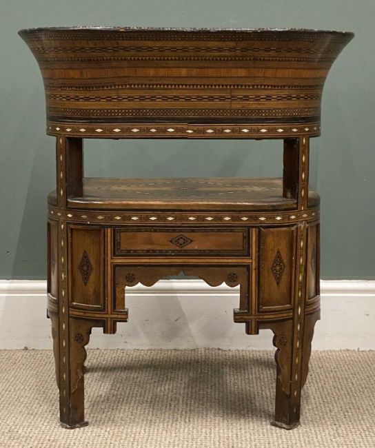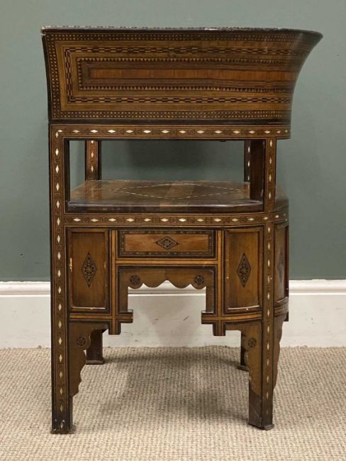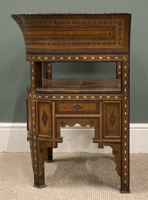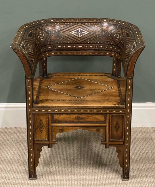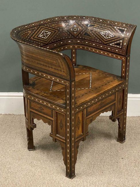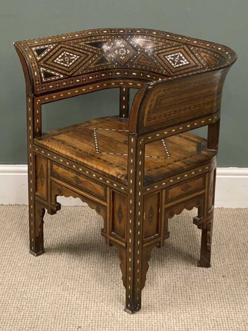 DAMASCUS ARMCHAIR late 19th Century, with mother of pearl and exotic woods inlay and marquetry detail throughout, 74 (h) x 63 (w) x 44cms (d)Provenance: private collection Wirral