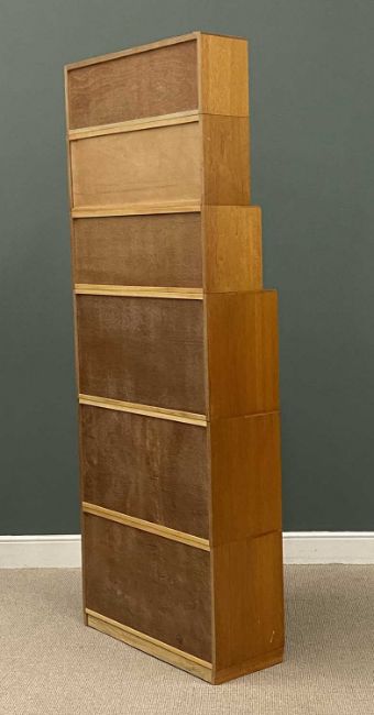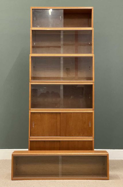 TWO SIMPLEX MID-CENTURY TEAK STACKING BOOKCASES, each of six levels, with sliding glass and wooden doors, 241 (h) x 92 (w) x 36cms (d) and 236 (h) x 92 (w) x 36cms (d), and an odd single section with glass sliding doors, 33 (h) x 122 (w) x 22cms (d)