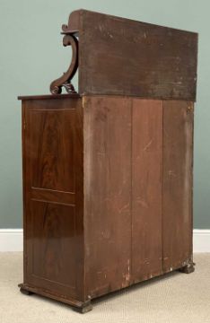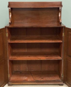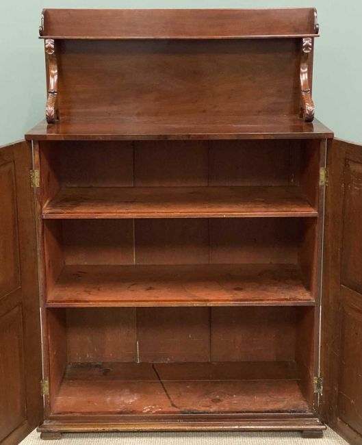 SMALL MAHOGANY TWO DOOR SIDEBOARD with shelved interior and rail-back upper shelf on acanthus supports, 149 (h) x 103 (w) x 50cms (d)Provenance: deceased estate Denbighshire