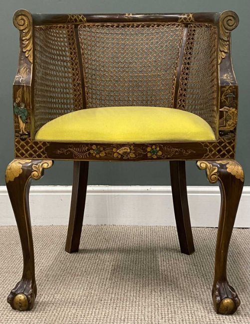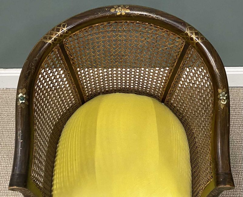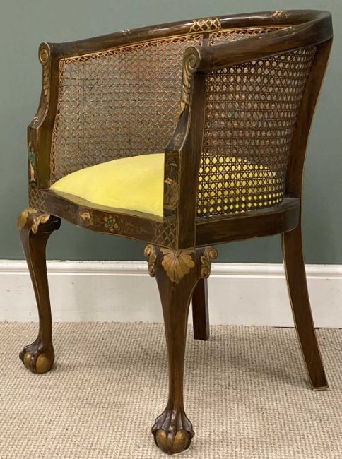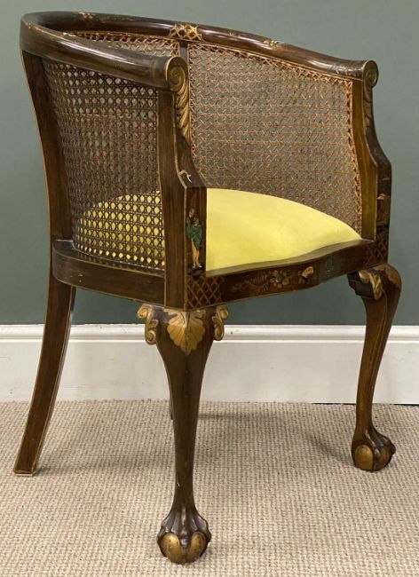 ORNATE PAINTED & INLAID CANE BACKED TUB CHAIR, on ball and claw feet, 81 (h) x 57 (w) x 47cms (d)Provenance: private collection Wirral