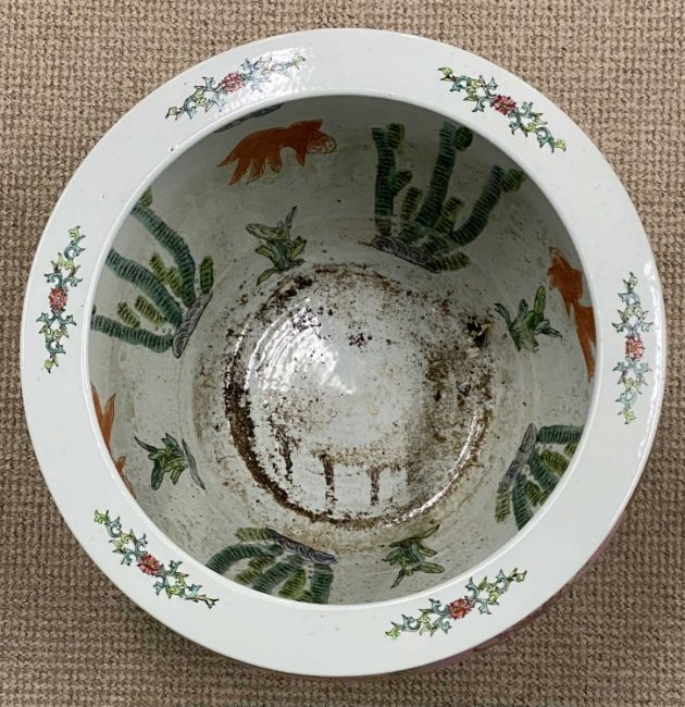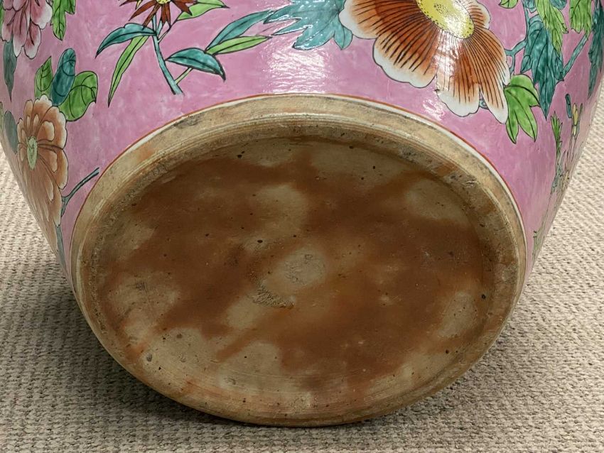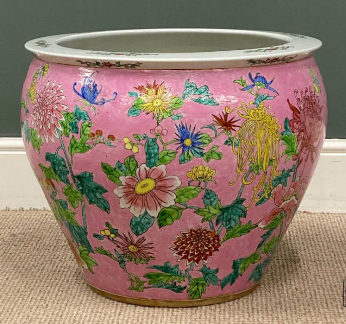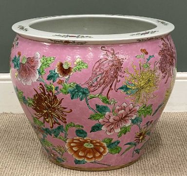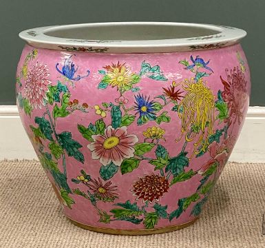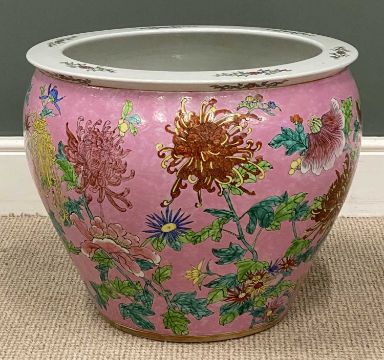 CHINESE POTTERY FISHBOWL, mid-20th century, decorated with chrysanthemums and other flowers on a pink ground, interior with goldfish and seaweed, 45 (h) x 53cms (diam.)Provenance: private collection Conwy