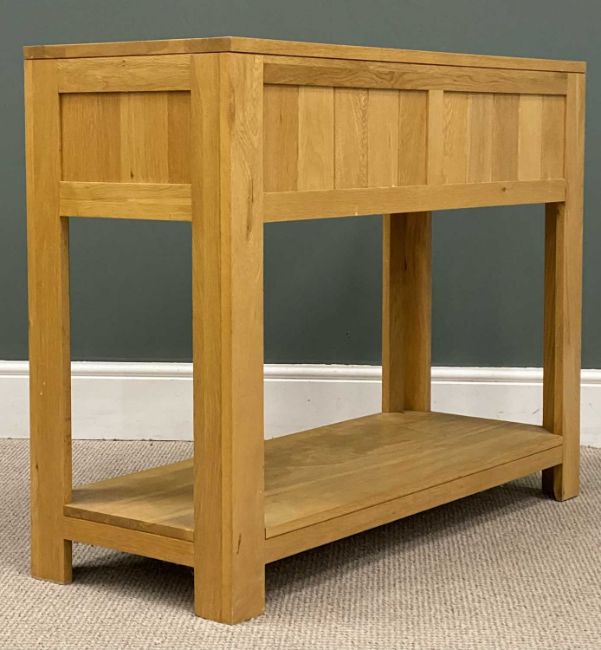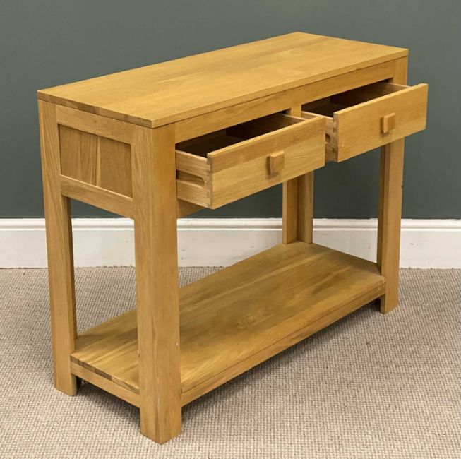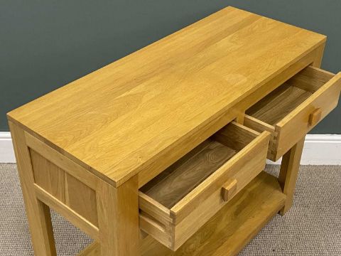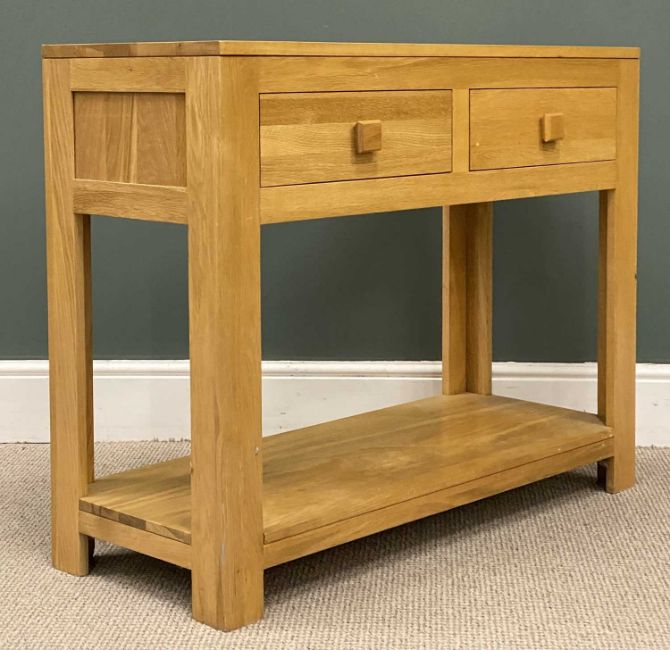MODERN LIGHT OAK COMPACT SIDEBOARD, two drawers and a base shelf, 80 (h) x 100 (w) x 41cms (d)Provenance: private collection Conwy