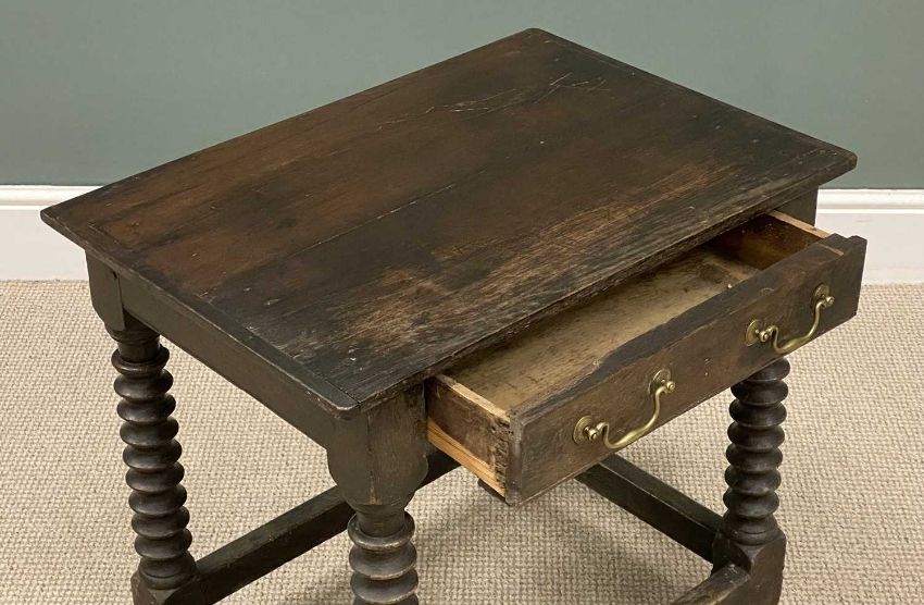 19TH CENTURY OAK LOWBOY, single drawer with twin brass swing handles, on turned and block supports with stretchers, 65 (h) x 70 (w) x 50cms (d)Provenance: private collection Conwy