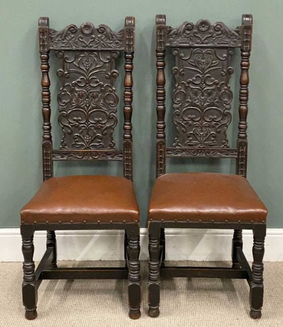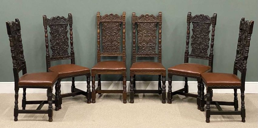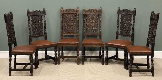 OAK WIND OUT DINING TABLE, c. 1900, 74 (h) x 145 (w) x 122cms (d) (no extra leaves or winder), and set of six carved high back chairsProvenance: private collection Conwy