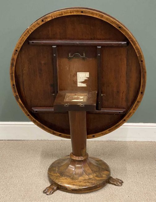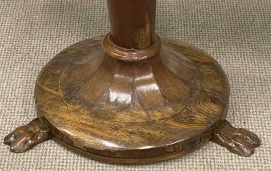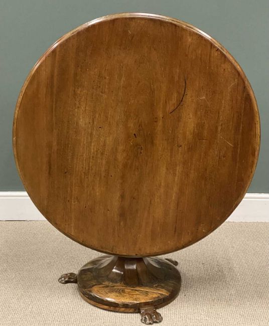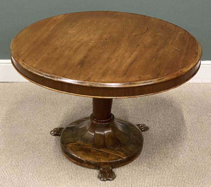 EDWARDIAN MAHOGANY & OAK CIRCULAR TOP TEA TABLE, tapered column and circular base, with three paw feet, 67 (h) x 99cms (diam.)