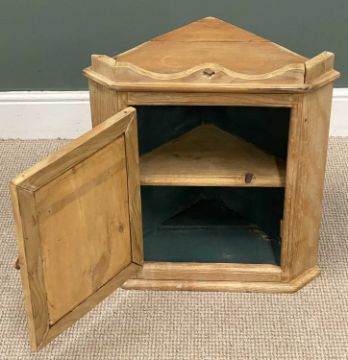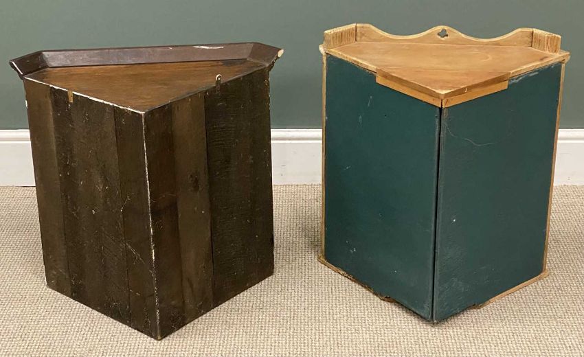 TWO SMALL VINTAGE CORNER CABINETS, one pine, 62 (h) x 58 (w) x 37cms (d), the other oak with carved tavern scene, 57 (h) x 62 (w) x 37cms (d) (2)
