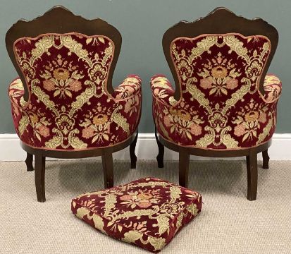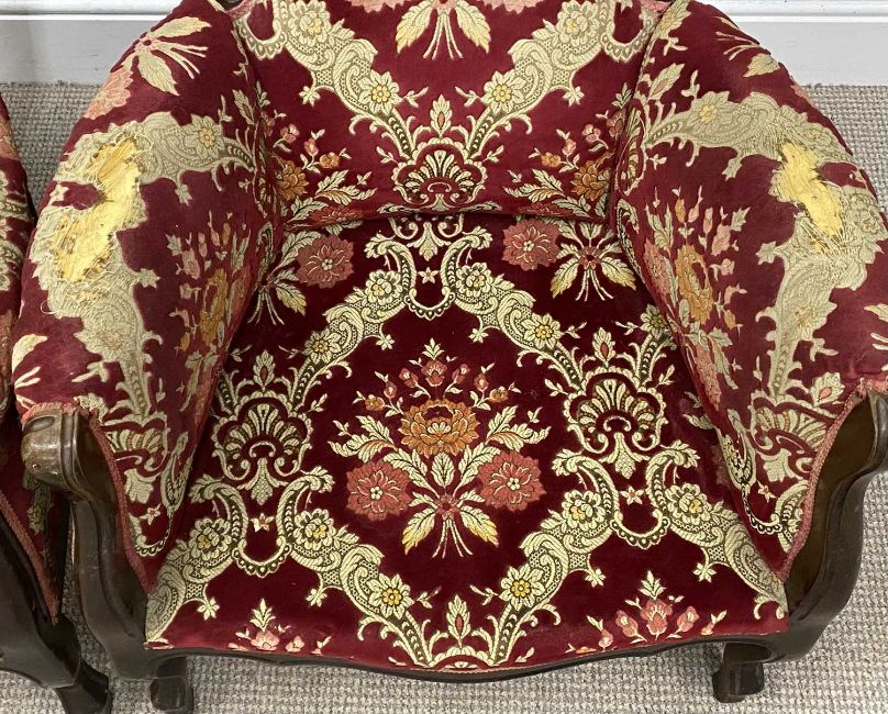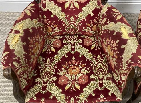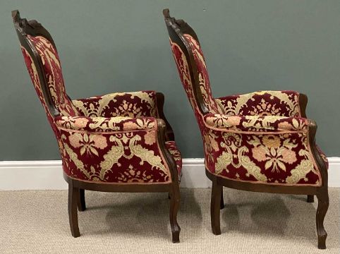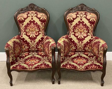 PAIR OF ANTIQUE CARVED SPOON BACK EASY CHAIRS, classically upholstered, 104 (h) x 71 (w) x 49cms (d)Provenance: private collection Conwy