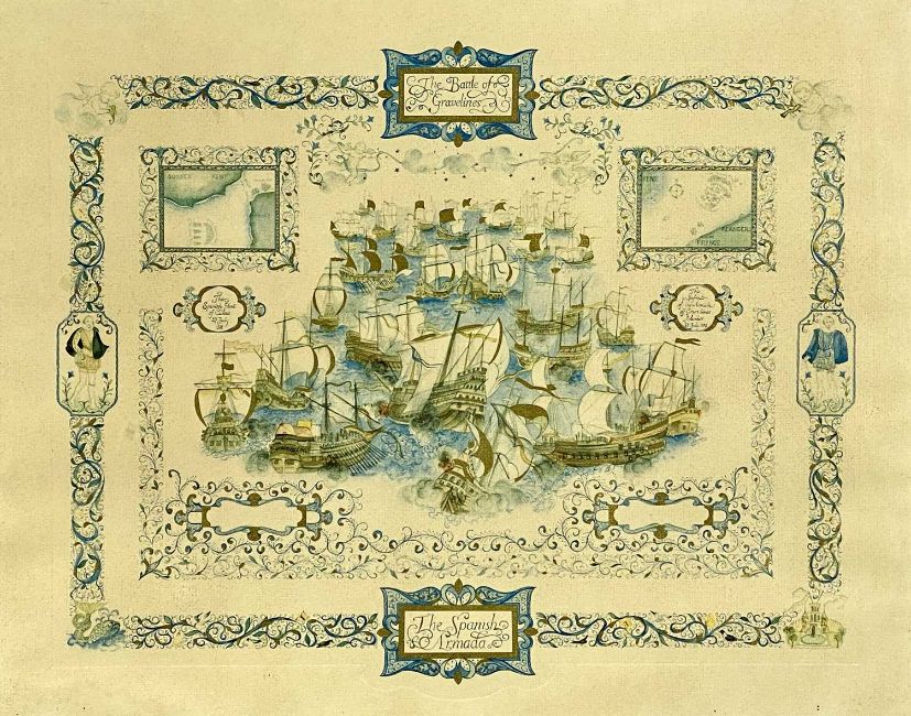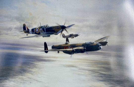 ROBERT TAYLOR (b. 1946) print - 'Memorial Flight', signed by various pilots, 45 x 63cms, and a pair of large gilded prints of the Spanish Armada, 55 x 73cmsProvenance: private collection DenbighshireComments: all framed and glazed