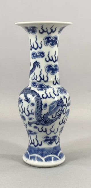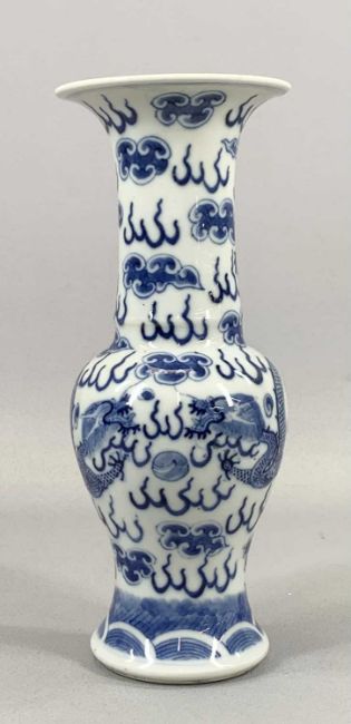 CHINESE BLUE & WHITE UNDERGLAZE VASE with waisted body and flared rim, decorated with dragons, four character mark to base, 25.5cms (h)Provenance: private collection Ynys Môn